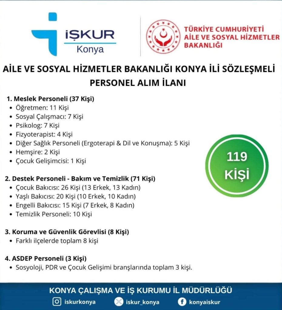 Aile ve Sosyal Hizmetler Bakanlığı, İŞKUR üzerinden Konya’ya 119 personel yerleştirecek. 15 Aralık’ta başlayan başvurular 26 Aralık 2025’e kadar devam edecek.