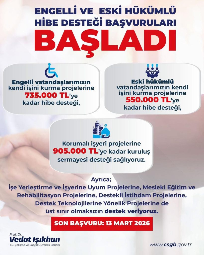 Işıkhan paylaşımında:’Engelli ve Eski Hükümlü Vatandaşlarımız İçin Hibe Desteği 2026 Yılı 2. Dönem Başvuruları Başladı!