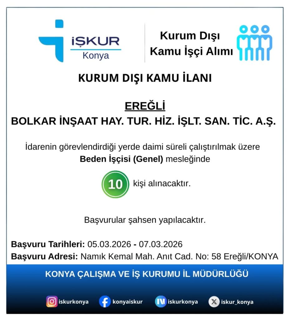 BOLKAR İNŞAAT HAY. TUR. HİZ. İŞLT. SAN. TİC. A.Ş. idarenin görevlendirdiği yerde daimi süreli çalıştırılmak üzere beden işçisi (Genel) mesleğinde 10 kişi alınacaktır.