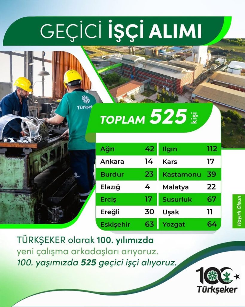 Türkşeker 100. yılında 525 geçici işçi alımı yapacak.