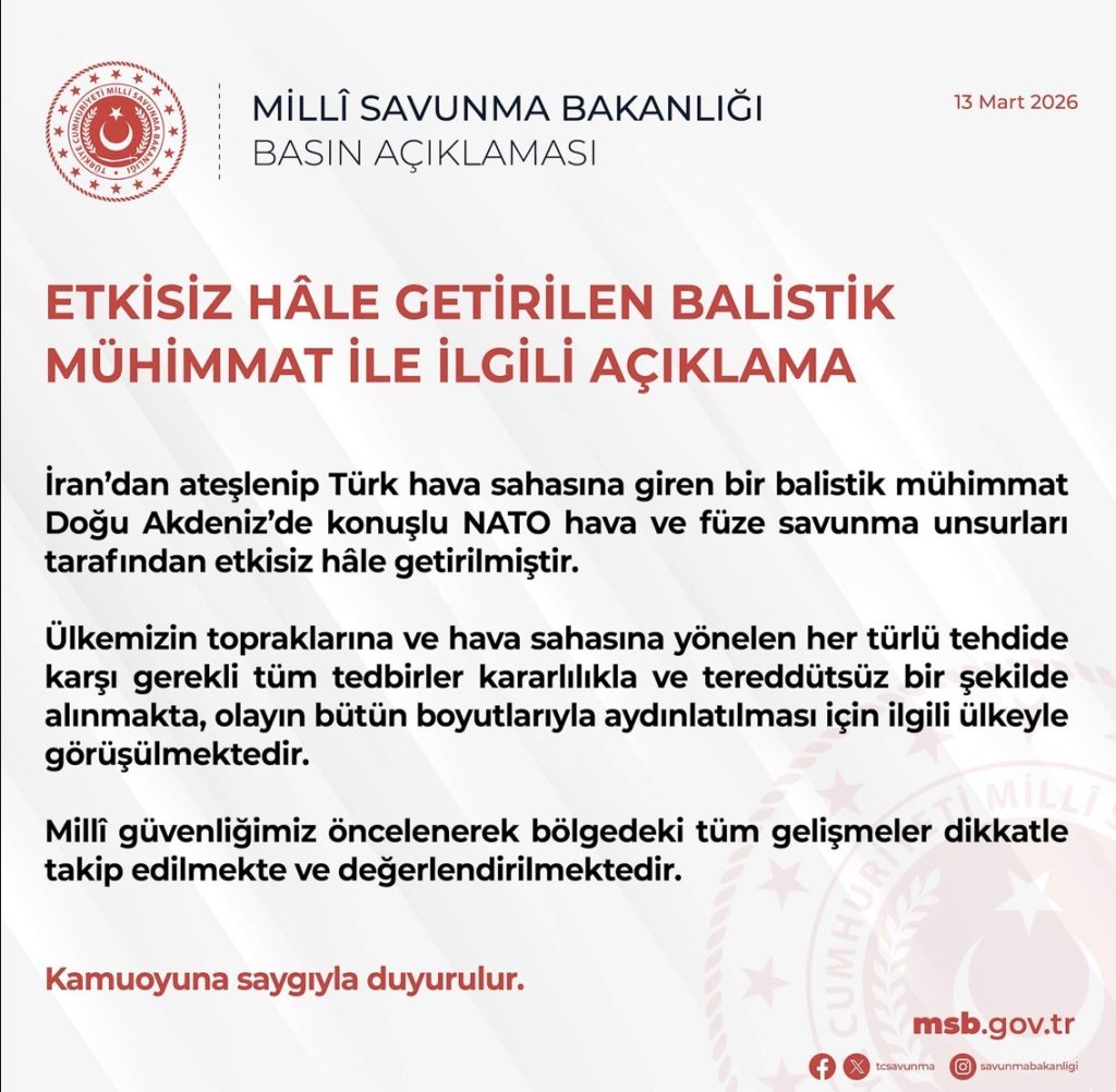 İran’dan ateşlenip Türk hava sahasına giren bir balistik mühimmat Doğu Akdeniz’de konuşlu NATO hava ve füze savunma unsurları tarafından etkisiz hâle getirilmiştir.