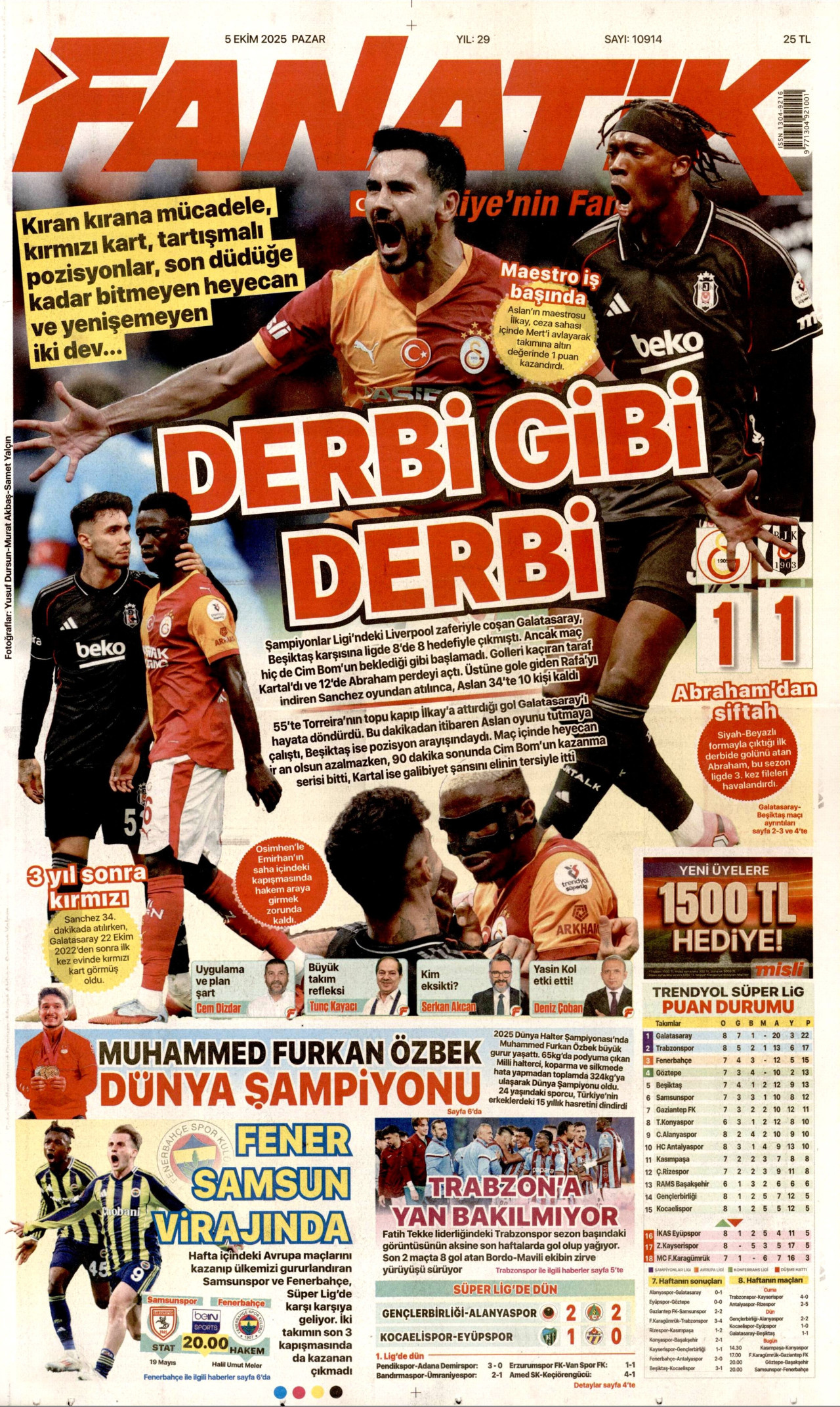 FANATİK Gazetesi 05 Ekim 2025, Pazar Günü Manşeti