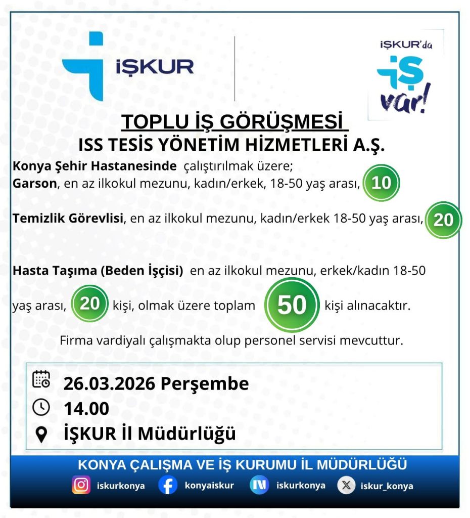 İŞKUR tarafından yapılan açıklamada; Konya Şehir Hastanesinde çalıştırılmak üzere;